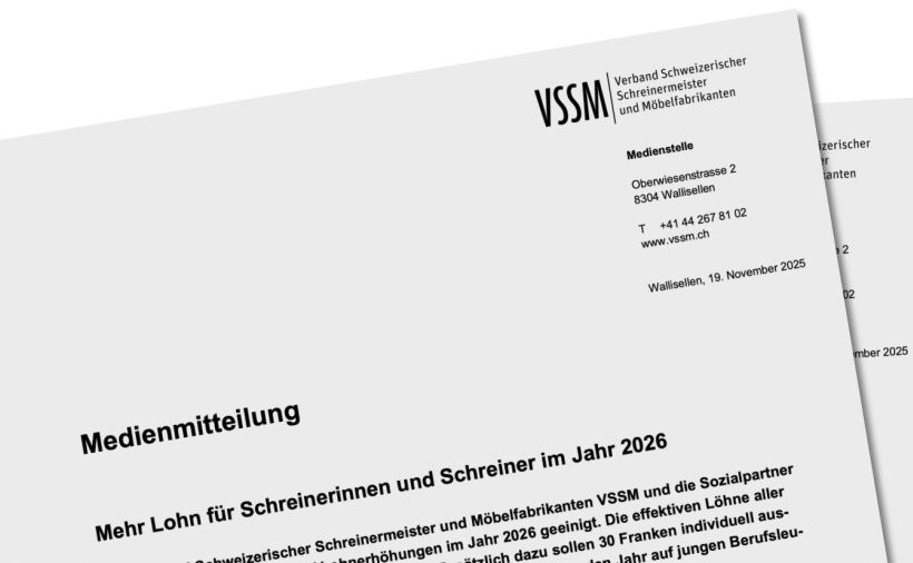 Der Verband Schweizerischer Schreinermeister und Möbelfabrikanten VSSM und die Sozialpartner Unia und Syna haben sich auf Lohnerhöhungen im Jahr 2026 geeinigt. Die effektiven Löhne aller Mitarbeitenden werden um 20 Franken erhöht. Zusätzlich dazu sollen 30 Franken individuell ausbezahlt werden. Bei den Mindestlöhnen liegt der Fokus im kommenden Jahr auf jungen Berufsleuten. Deren Löhne werden um 2.5 Prozent erhöht.