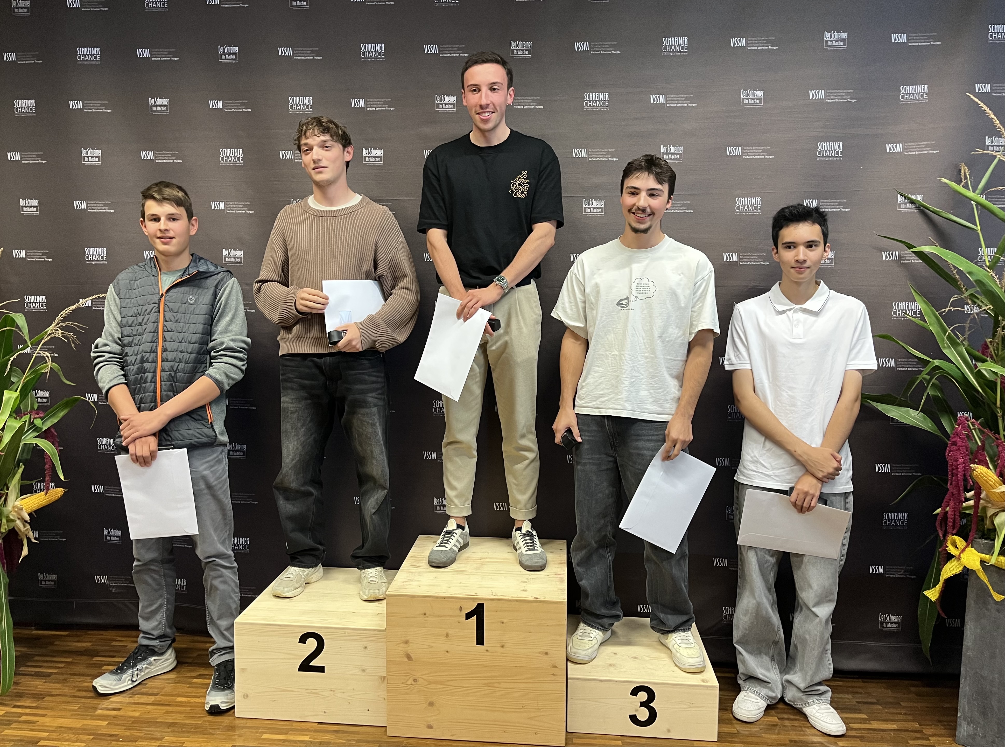 Diese jungen Schreinerlernenden belegten beim "Schreiner Chance 2025"-Wettbewerb die ersten fünf Plätze in der Gesamtrangliste. In der Mitte der Sieger aus Kreuzlingen, Leandro Genovese.